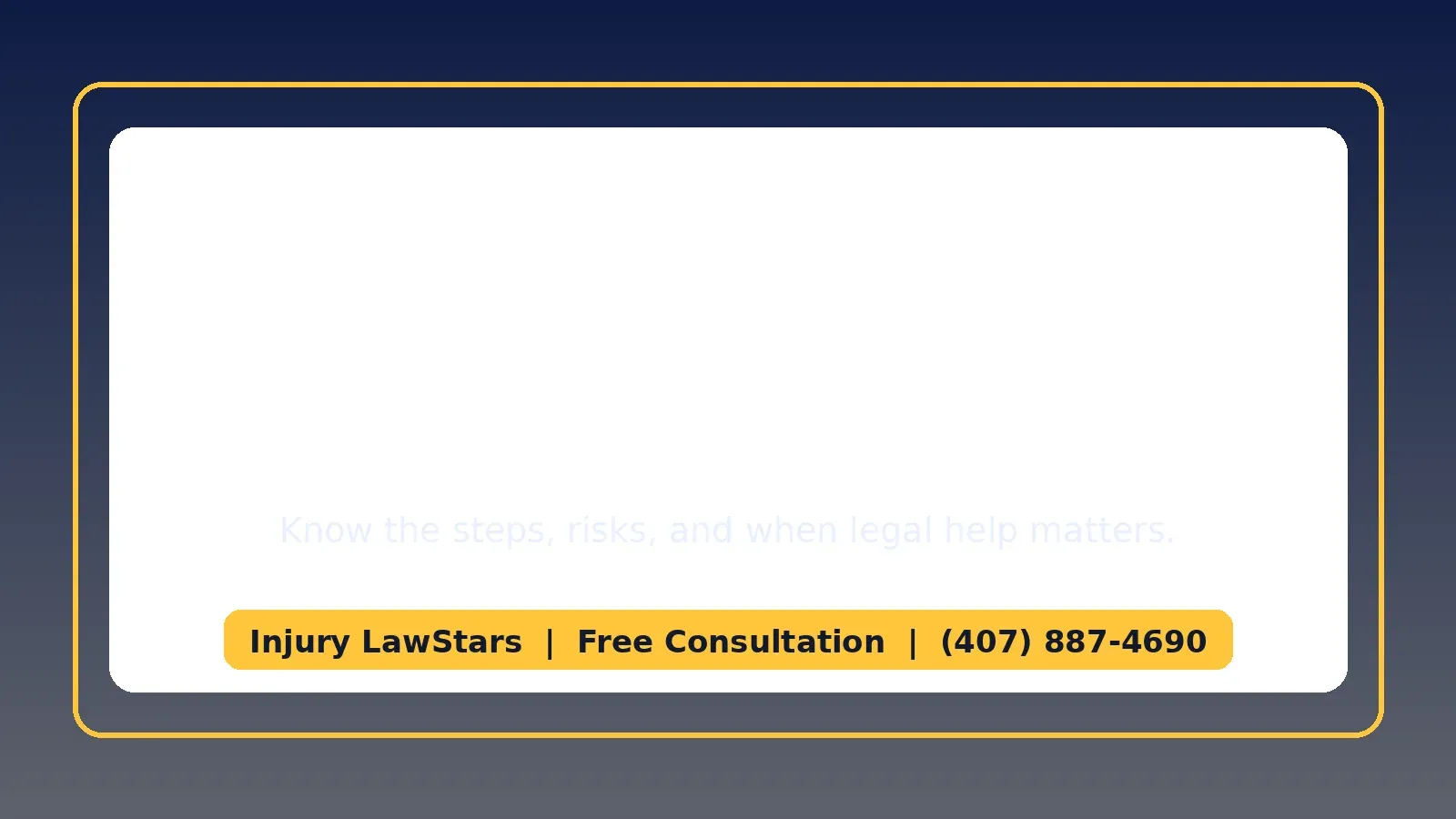 Call 911 to report the accident and get a police report. Seek medical attention immediately — some serious injuries like internal bleeding and TBI do not present symptoms right away. Document the scene with photos, collect witness contact information, and do not give a recorded statement to any insurance company before speaking with an attorney. Then call Injury LawStars at (407) 887-4690.